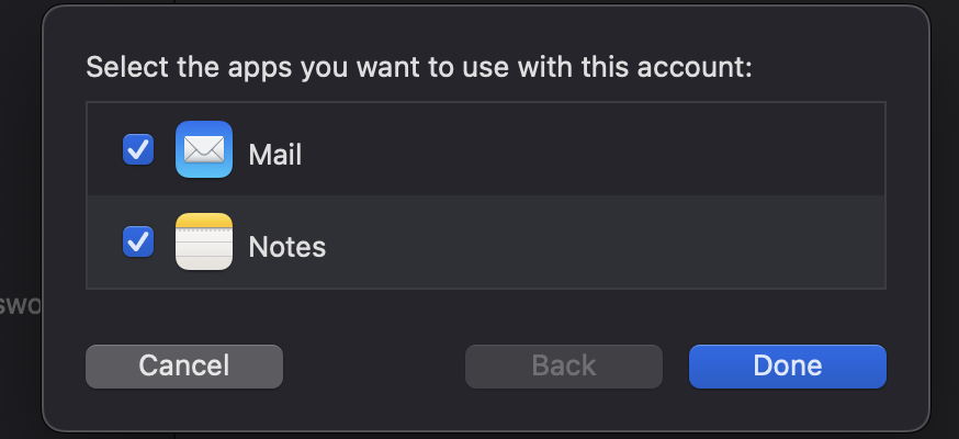 After the confirguration has been entered and they customer has clicked on "Done" the account will attempt to verify if succesful the next screen will ask the customer to chose the use of mail and notes, have the customer check off both and click on "done" once more