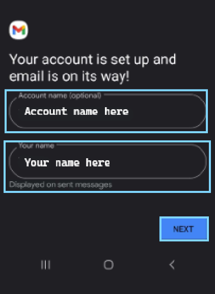 In the final screen you can assign an account name and your name to the email account, click on Next and you are ready to use your domain based email within your Gmail App.