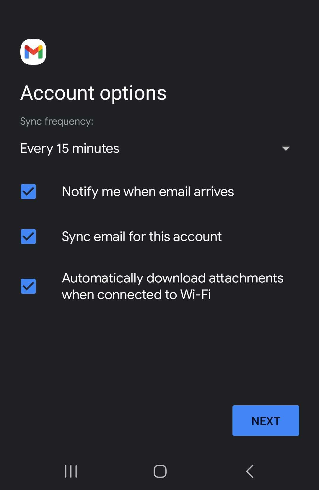 Once confirmed you can then dictate how often you wish for your account to check for new mail as well as configure your notification preferences, Once happy with the settings click on next