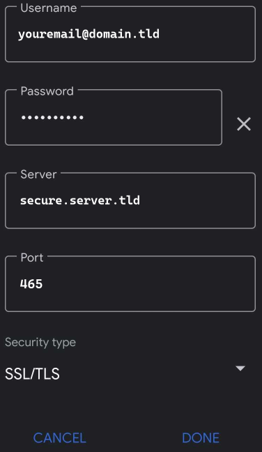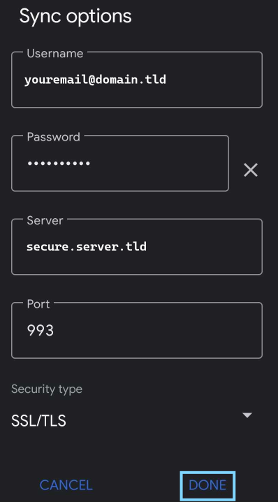 Enter the incoming server information provided by your email host and click on "DONE" to verify the incoming connection