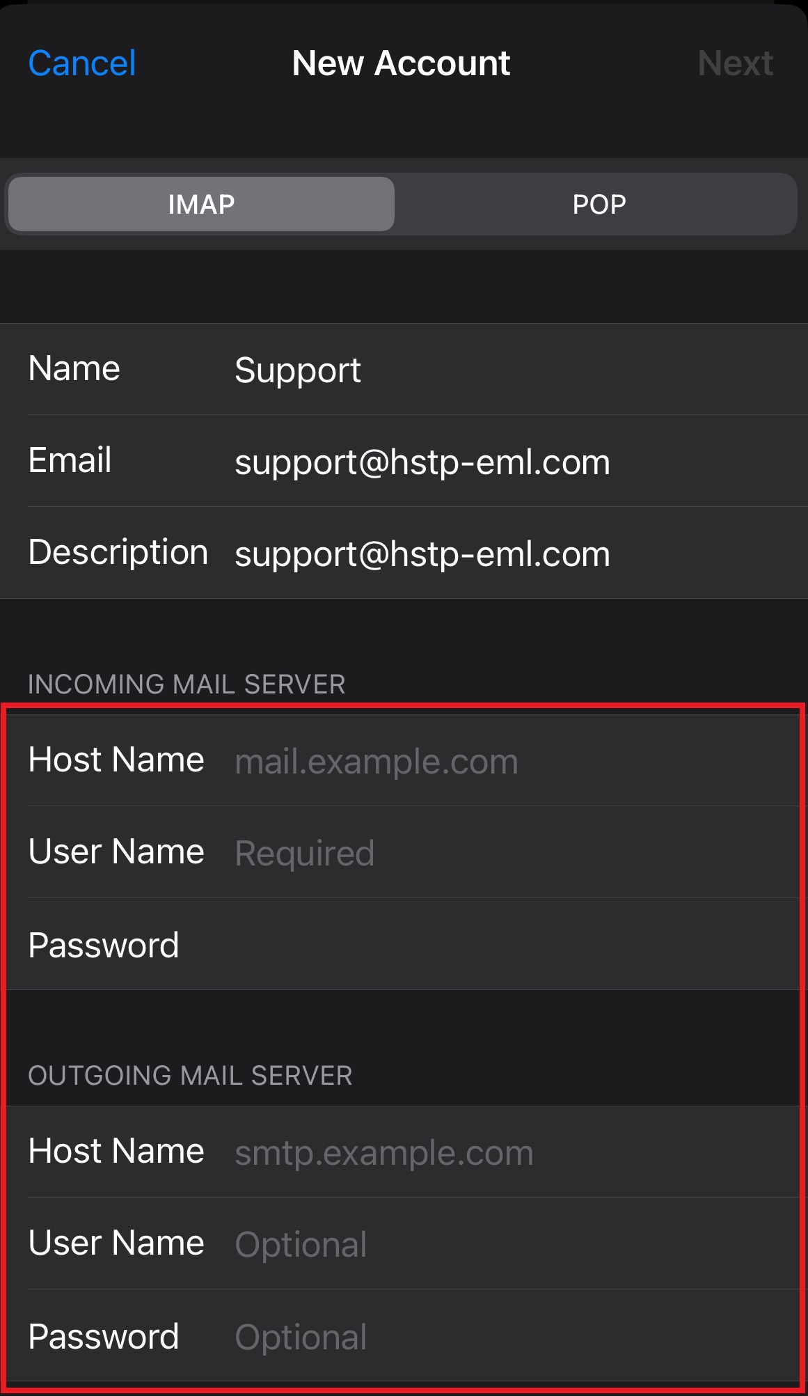 Once the password has been entered incorrectly the customer should be brought to a screen to select the mail protocol as well as enter the incoming and outgoing server info
