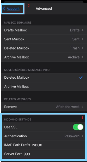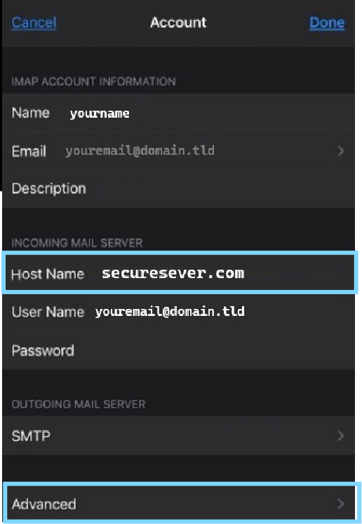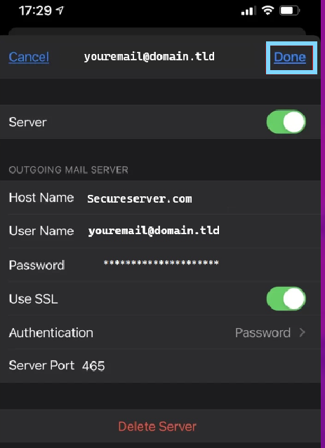 Once you have configured your outgoing settings in accordance with the info provided by your email host, tap on "Done" and you will be met with either 2 to 3 blue check marks or be brought back to the main email settings page, these will both indicate successful connection to your email server