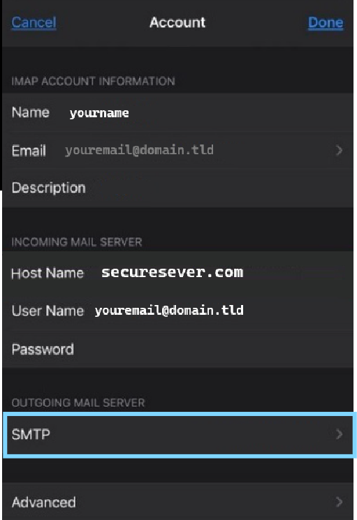 To modify the outgoing email server settings tap on SMTP then tap on the server name that is currently shown to be active or may be listed as you "primary" server