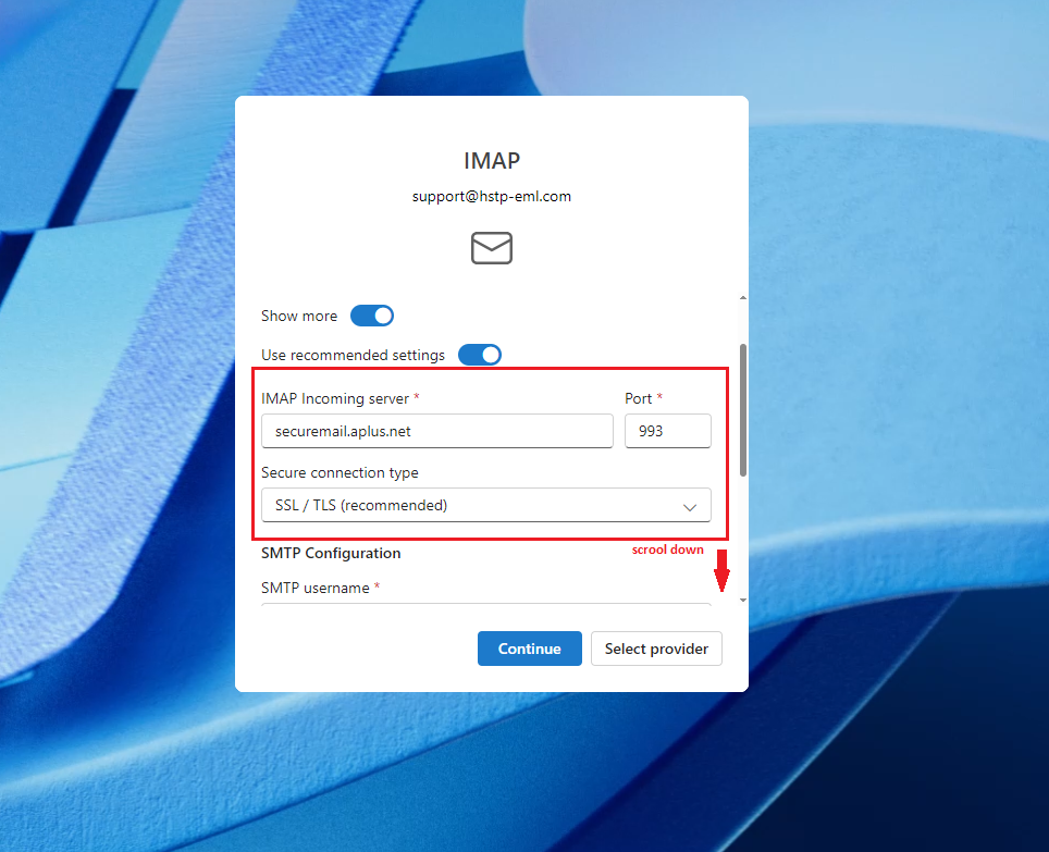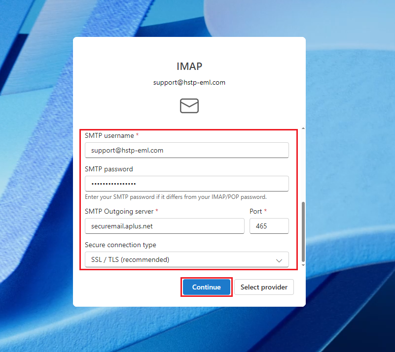 Have the customer enter the appropriate outgoing SecureMail settings for the partner they are hosted by then click "continue"
