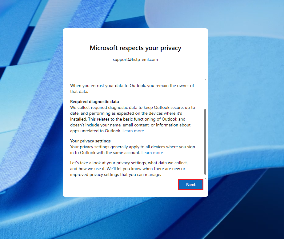To add a New account to the new outlook when no accounts are exising have the customer open the program, they will then be presented with the screen above.