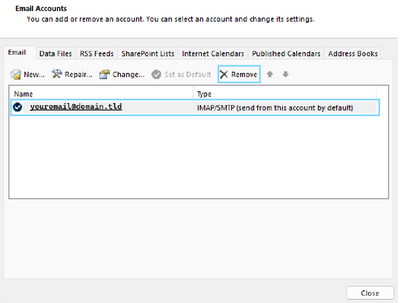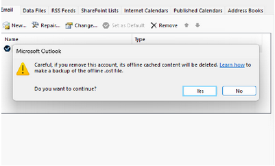Click "yes" , and outlook will remove the account and associated cached data.