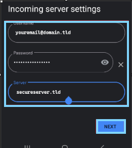 Enter the Incoming mail server settings provided to you by your email host, click on "Next"