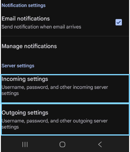 To modify the current server settings of you email on an android device,