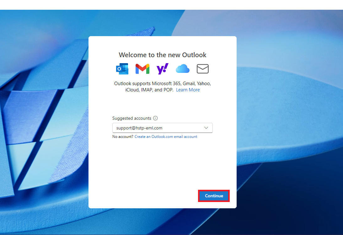 To add a New account to the new outlook when no accounts are exising have the customer open the program, they will then be presented with the screen above.