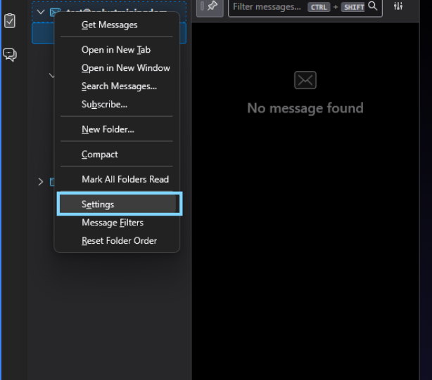 To Edit the settings on an existing account in thunderbird right click on the account you want to edit and select "Settings"
